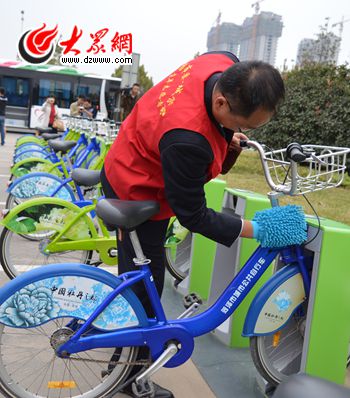 志愿者每天都來清潔公共自行車。 記者 王宗陽攝