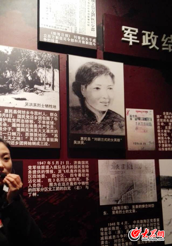 講解員徐徐敘述著那些年那些人那些事,那些血雨腥風(fēng)中的浩然正氣,“老渤海”精神,是大寫的立體的,是一個(gè)又一個(gè)無私無畏的革命先烈們用鮮血書就的。它是山東省第一個(gè)農(nóng)村基層黨支部——壽光黨支部的星星之火;是山東省第一次農(nóng)民暴動(dòng)——博興“八四”暴動(dòng)的勇敢嘗試;是博興縣共產(chǎn)黨員李天佑為掩護(hù)向上級(jí)黨組織請(qǐng)示匯報(bào)工作的縣委聯(lián)絡(luò)員李相韓,自稱是“李相韓”而慷慨“替死”的悲壯大義;是馮景恩被捕后執(zhí)行槍決居然三槍未死,被群眾救回康復(fù)后毅然重新投入抗日救國事業(yè)的執(zhí)著不悔;是一馬三司令,馬氏三兄弟先前仆后繼抗日救國、為國捐軀的壯懷激烈;是大生產(chǎn)運(yùn)動(dòng)時(shí),渤海區(qū)人民生產(chǎn)自救的自強(qiáng)不息;是渤海人民依托青紗帳作掩護(hù),跟日本鬼子進(jìn)行斗爭(zhēng)的艱苦卓絕;是尹洪英送郎參軍,“好父母教兒拿起槍,好妻子送郎上戰(zhàn)場(chǎng)”的無怨無悔;是樂陵縣常大娘帶領(lǐng)全家挖地道、地洞,先后掩護(hù)60多名黨政干部的機(jī)智淡定;是吳洪英為掩護(hù)我黨同志轉(zhuǎn)移,面對(duì)敵人的嚴(yán)刑拷打始終緊閉雙唇,最后在鍘刀下從容赴死的錚錚鐵骨;是解放戰(zhàn)爭(zhēng)期間,渤海區(qū)共抽調(diào)支前民工達(dá)81.9萬人次,有17.2萬名渤海區(qū)人民的優(yōu)秀子弟光榮參軍,喊出了“傾家蕩產(chǎn)、支援前線”的口號(hào)的渤海人共籌集軍糧10.45億斤的無私奉獻(xiàn)。一個(gè)個(gè)鮮活的生命一頁頁輝煌的革命史,渤海區(qū)的先烈們用可歌可泣的事跡闡釋著“老渤海”精神,踐行著“老渤海”精神。