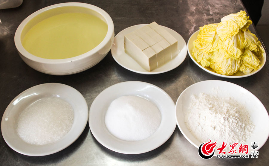 大眾網泰安4月29日訊(見習記者 張天天 報道)在泰安地區,有這樣一句家喻戶曉的俗語:“泰安有三美:白菜、豆腐、水。”許多外地游客來泰安,也對“泰安三美”充滿“敬仰”。爬完泰山后,都會像模像樣找家本地餐館,點上一份“三美湯”。卻往往在菜上桌之后大呼上當:“這不是白菜燉豆腐么?”記者也在泰山周邊的餐館里見過這種不正宗的“三美湯”:湯汁清澈見底,豆腐色黃,白菜也不鮮嫩。今天,記者來到了位于泰安紅門路的泰山賓館百花餐廳,帶網友品嘗正宗的“泰山三美湯”。