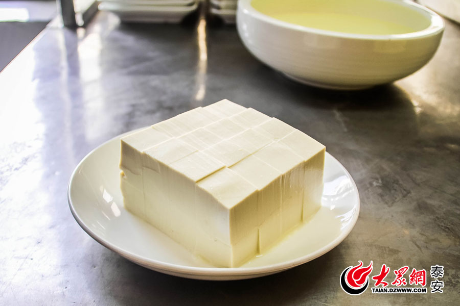 《泰安縣志》記載:“凌晨街街梆子響,晚向戶戶豆腐香,泰城家家豆腐坊。”“三美”之一的豆腐需要使用北方黃豆加石膏制成的石膏豆腐。泰山水高氧、低硬度,用其磨制的豆漿蛋白質極易凝固,使泰山豆腐具有漿細水多、質嫩不流、潔白如雪、味道甘美、富有彈性、久煮不老不糊等特點。