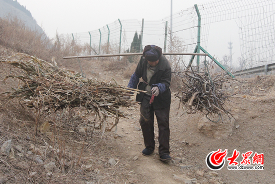 在劉大娘的指引下,大眾網記者沿著小路出村,步行大約1公里在礦村東面的一片小山上看到了正在砍柴的“山貨大爺”楊洪義。遠遠地,記者看到楊洪義手持鐮刀,把一些枯干的灌木樹枝砍倒,然后將樹枝和玉米秸稈等簡單分類歸攏到一起。雖然已經年過80,但是楊洪義老人身體硬朗、手腳麻利,一人多高的地崖子他爬上爬下行動自如,不一會兒就拾了兩小堆柴火。