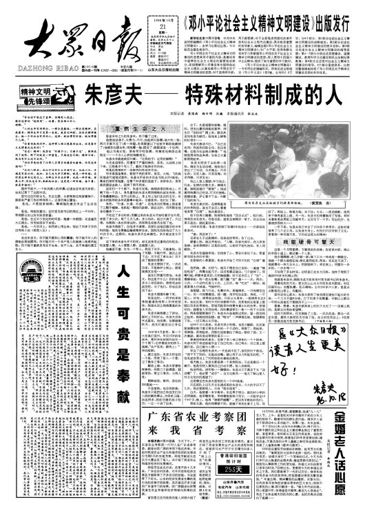 1996年,本報頭版頭條刊發朱彥夫事跡報道。