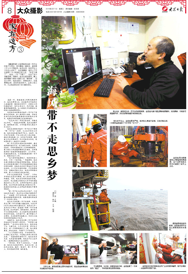 趙忠生是新勝利鉆井一號(hào)平臺(tái)經(jīng)理,從1995年參加工作起,趙忠生就在海洋鉆井平臺(tái)上,平臺(tái)上的工作人員分兩班,每20天固定輪換一次,而作為平臺(tái)經(jīng)理,遇有重大作業(yè)還要值守。對(duì)趙忠生來(lái)說(shuō),能回家和家人一起過(guò)年十分難得。