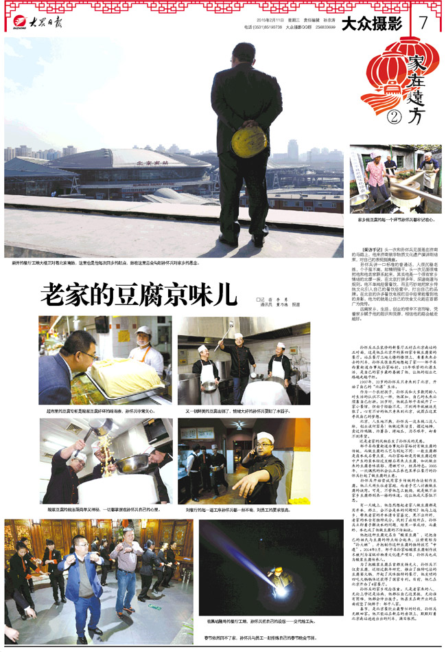 孫懷兵正在裝修的新餐廳正好在北京南站的正對面,這是他在北京開的第四家專做豆腐宴的餐廳。站在餐廳工地大樓的樓頂上,看著來來去去的列車,孫懷兵很自然地想起了家——鄒平縣西董街道辦事處孫家峪村。18年艱苦的北漂生活,是自己的家鄉最終眷顧了他,讓他的創業之路越走越平坦。