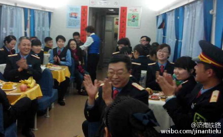 @大眾網:2月18日20:30,聚餐前,大家請即將退休的李建國老師發表新春感言。李老師說:“今年是最后一個列車除夕,經歷了四代列車,六次大提速,能為旅客服務這么多年,自己很知足也很滿足,感謝同事們多年來的關心,今年除夕將是自己人生經歷中最難忘的一個。”