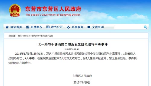山東24小時10日訊 據東營市東營區人民政府官網消息,6月9日15時左右,東營區萬達廣場在維修污水井排污設備過程中發生疑似沼氣中毒事件,1名維修人員現場死亡,4人中毒,在醫院救治過程中2人搶救無效死亡,另2人生命體征正常,暫無生命危險。事件具體原因正在調查中。