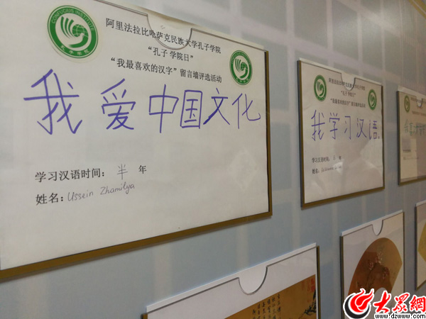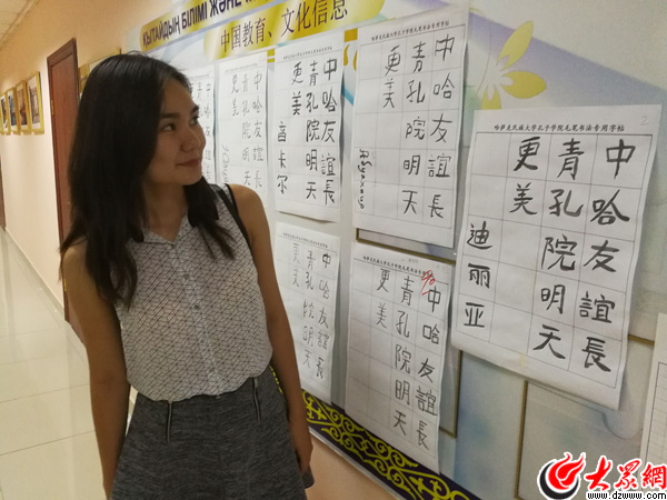 19歲的哈薩克斯坦姑娘成樂向采訪團展示同學們寫的漢字。