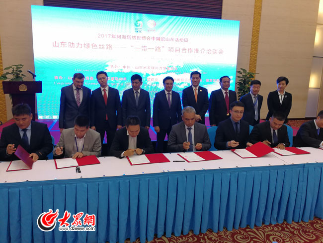 隨后,9月6日下午,山東助力綠色絲路——“一帶一路”項目合作推介洽談會,在阿斯塔納北京大廈成功舉辦。有12家中哈雙方單位、企業集中簽定了合作協議,總投資額約23.6億元,涉及能源開發、商貿物流、農業科技、產能合作、旅游合作等相關領域。