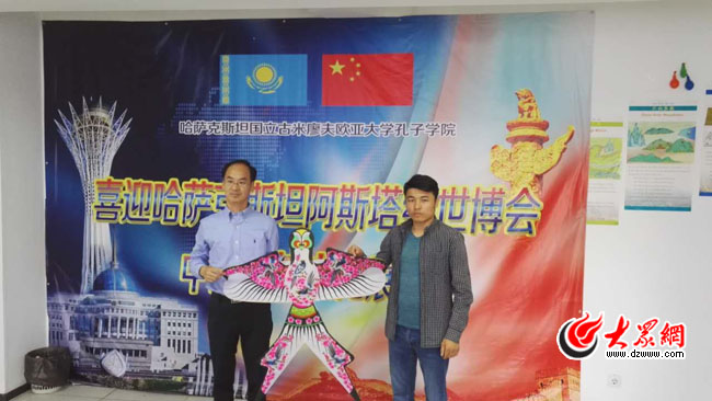 省政府新聞辦主任魏長民(左)向哈薩克斯坦歐亞大學孔子學院贈送非遺產品濰坊風箏。