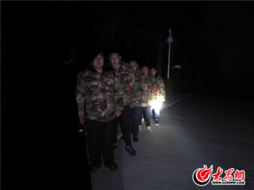晚7點,蒙山防火巡邏隊準時集合,每人領取防火服、對講機、哨子、手電筒等裝備后分頭行動。大眾網(wǎng)記者跟隨黨員高祥余一組從西側(cè)出發(fā),一行六人步履蹣跚的走在盤山小道上,登高望遠,不放過任何一個蛛絲馬跡。當爬到海拔1000米的山脊線棲鳳山上時,對講機里不時傳來“一切正常”的聲音,林海里也不時傳來高科技設備嚴禁帶火上山的聲音,這恰恰是云蒙景區(qū)寂靜冬夜里最美妙的聲音。正是這一句句的平安預防提示和守夜人一步步的丈量,共同為這片青山綠水、金山銀山豎起了“防火墻”、“隔離帶”。
