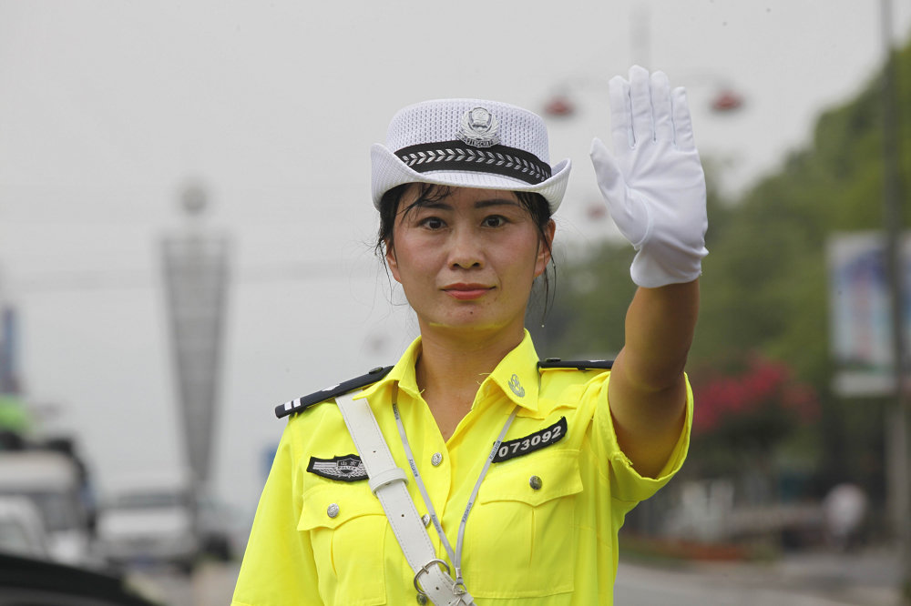 女民警在高溫下執(zhí)勤,5分鐘后就會大汗淋漓。