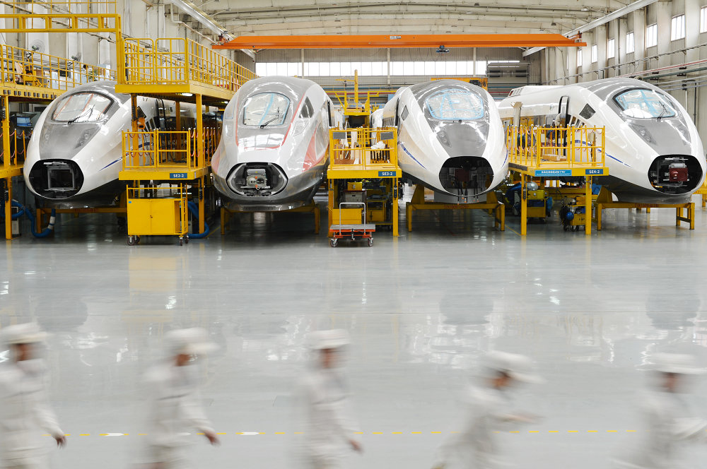 3260 總裝車間,下班后的工人列隊(duì)走過生產(chǎn)線上成排的高速動(dòng)車組。