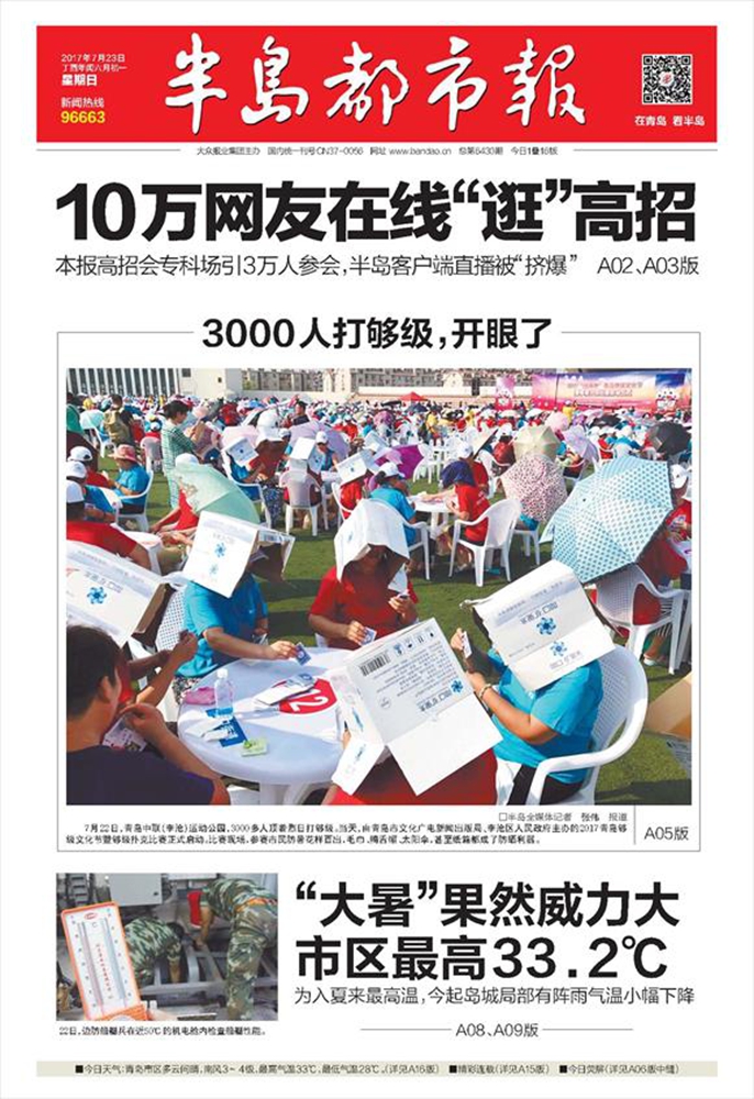 2017年7月22日,青島中聯(李滄)運動公園,3000多人頂著烈日打夠級。當天,由青島市文化廣電新聞出版局、李滄區人民政府主辦的2017青島夠級文化節暨夠級撲克比賽正式啟動。比賽現場,參賽市民防暑花樣百出,毛巾、鴨舌帽、太陽傘,甚至紙箱都成了防曬利器。半島都市報 張偉攝影
