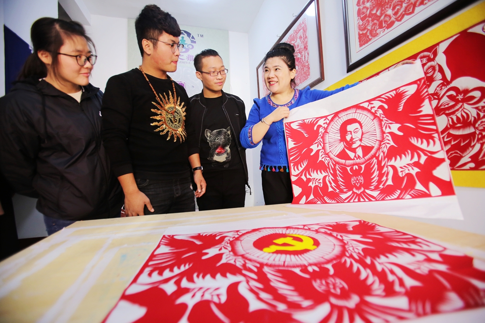 10月19日,我市“非遺”剪紙項(xiàng)目代表性傳承人石洪霞正在向市民展示剪紙作品。為歡慶黨的十九大的勝利召開,日前,石洪霞創(chuàng)作了系列作品,用剪紙的形式表達(dá)了基層群眾對(duì)黨的十九大勝利召開的喜悅之情。滕州日?qǐng)?bào) 李丹 攝