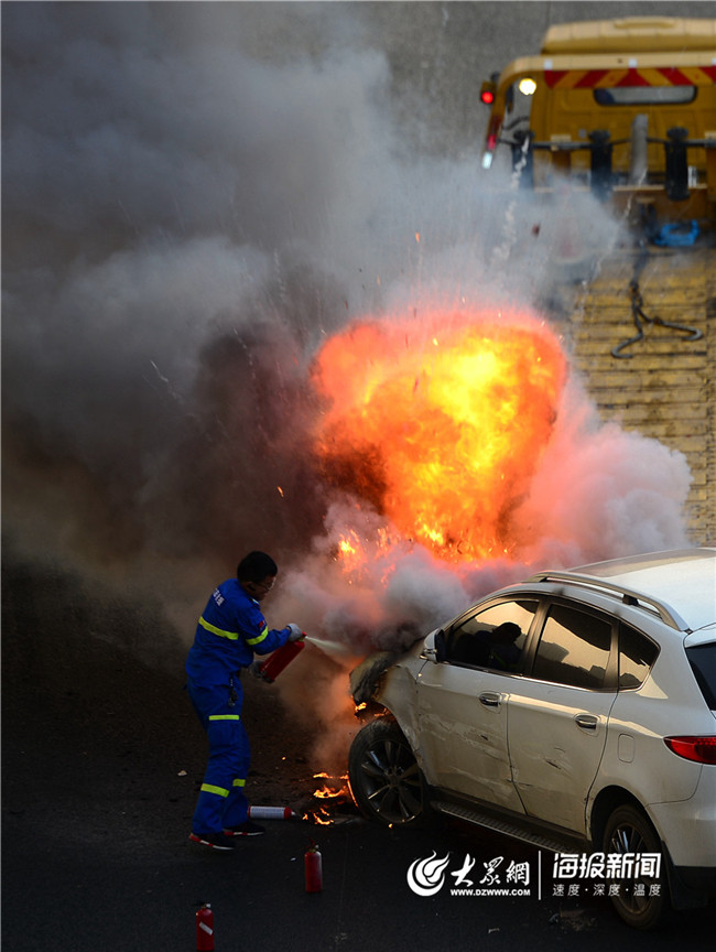 2018年12月11日下午,濟(jì)南市青島路與淄博路路口附近發(fā)生一起車禍,一輛白色SUV車頭受損嚴(yán)重,司機(jī)撥打了大陸救援電話。拖車人員正打算將白色事故車拖走,突然發(fā)生了以上那一幕。拖車人員王慶云發(fā)現(xiàn)后,當(dāng)即拿上滅火器沖過(guò)去,不顧爆燃被炸飛的塑料殼,站在車前滅火,控制住了火勢(shì)。 濟(jì)南時(shí)報(bào) 作者 王 鋒 編輯 鄭楚翹