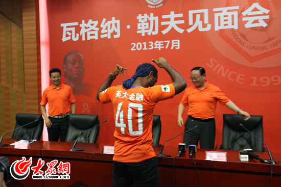 大眾網濟南7月31日訊(見習記者 劉明明)今天下午,魯能泰山俱樂部為來自巴西的魯能新外援瓦格納·勒夫舉行了媒體見面會。勒夫在見面會上展示了他的40號球衣,隨后回答了記者的提問,并接受了大眾網網友和球迷贈送的禮物。