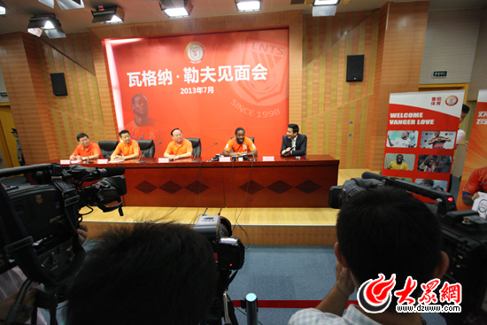 今天下午,魯能泰山俱樂部為來自巴西的魯能新外援瓦格納·勒夫舉行了媒體見面會。勒夫在見面會上展示了他的40號球衣,隨后回答了記者的提問,并接受了大眾網網友和球迷贈送的禮物。