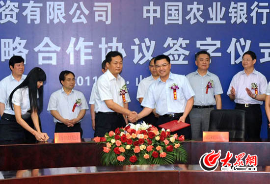 山東省金融辦副主任郭永利、人民銀行濟南分行副行長肖龍滄、山東銀監局副局長王朝弟應邀出席簽字儀式。儀式上,農行山東省分行行長陳軍、山東海洋投資有限公司董事長包劍英先后致辭,農行山東省分行副行長張曉男、山東海洋投資有限公司董事長襲建兵副總經理分別代表雙方簽署《戰略合作協議》。