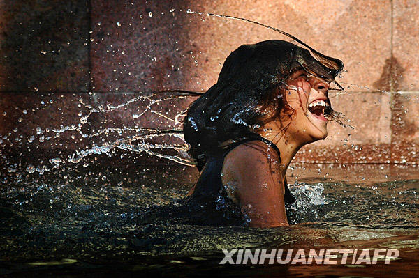 4月24日,在智利首都圣地亞哥,一名女孩在廣場噴泉中戲水。在經過酷熱夏天后,如今已進入秋末的圣地亞哥天氣仍不涼爽。新華社/法新