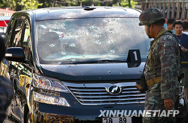 據(jù)泰國電視臺報道,乘車出行的頌提在曼谷ASTV電視臺附近遭一伙不明身份人員襲擊。他們先將車胎擊破,隨即向車內(nèi)開槍。