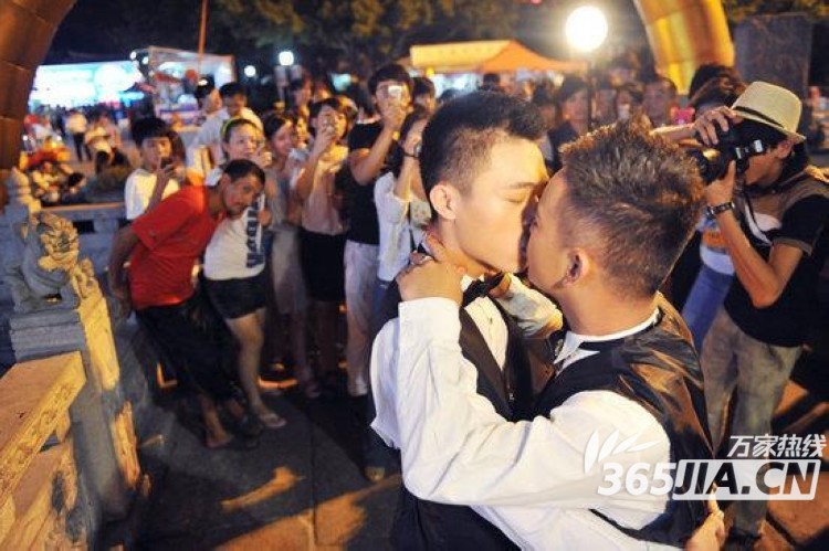 福建泉州首對(duì)男同公開結(jié)婚,當(dāng)街拍婚紗照并激吻。13日中午,泉州關(guān)帝廟附近的一影樓非常熱鬧,一對(duì)同志(男同性戀者)正在拍婚紗照。他們是福建首對(duì)公開結(jié)婚的同志——24歲的陸忠和20歲的劉萬(wàn)強(qiáng)。十一期間,他們將在寧德老家舉辦婚禮。