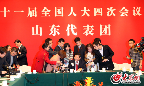 大眾網北京3月7日訊(特派記者 李冉 煒程 國棟 曹亮 王磊) 3月7日下午,參加十一屆全國人民代表大會第四次會議的山東代表團對媒體開放,吸引了75家中外媒體記者到場。此次對媒體開放的是山東團第二小組,全國人大代表、山東省委副書記、省長姜大明也在這個小組參加審議。代表審議政府工作報告結束后,各媒體記者就各自關心的有關山東的熱點問題紛紛提問,姜大明省長給予了認真答復,仔細進行了“解說”。姜大明省長現場回答了大眾網記者的提問,并回答了大眾網網友提出的八個問題,稍后本網將帶來詳細報道。