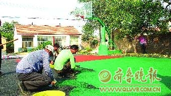 25日下午2點(diǎn)許,來(lái)自鄰村的一個(gè)施工隊(duì)正在大由村一處新建籃球場(chǎng)上鋪塑膠。即將建好的籃球場(chǎng)紅綠相間,掩映在冬棗樹和居民瓦房之間。