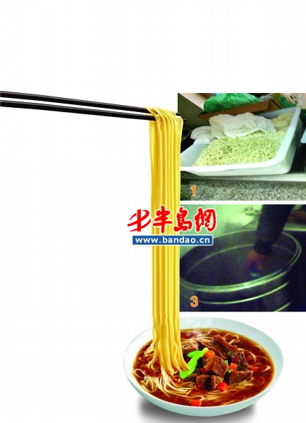在把剛做出來的面條搬到廚房時(shí),阿元問總部派來的一位指導(dǎo)師傅,“你看看這些昨晚的面還能繼續(xù)賣嗎?”指導(dǎo)師傅看了看面條后點(diǎn)了點(diǎn)頭。隨后,這些隔夜的面條被放在新做出的面條上面。