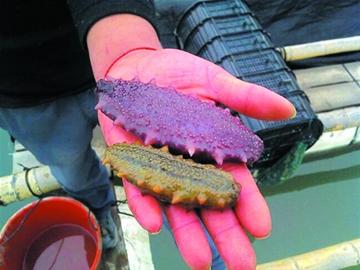 青島養(yǎng)殖戶撈出白紫綠彩色海參 5只價(jià)值16萬(wàn)