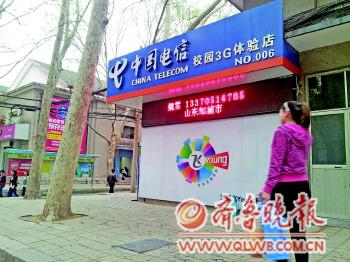 15日下午5點,在山東師范大學(本部)1號宿舍樓東邊的中國電信校園3G體驗店,營業廳的電子屏幕正顯示著一名學生的姓名、手機號和家庭住址。