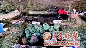 本報臨沂4月17日訊(記者 喬顯佳) 17日下午,記者再次來到發現春秋諸侯王級墓葬的沂水縣泉莊鎮天上王城景區,考古發掘較16日又有較大進展。南、北邊箱成堆的青銅重器基本裸露出土。