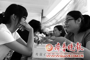 [提要] 22日,山師大附中幸福柳校區(qū),心理老師為高三學(xué)生進行考前心理咨詢。盧敏說,根據(jù)對高三學(xué)生的心理測試摸底,大部分學(xué)生都存在輕度或中度焦慮,屬于正常范圍,適當(dāng)焦慮能使人處于應(yīng)激狀態(tài),保持精力充沛,“這是件好事兒,太輕松了也不好。重度心理焦慮要克服不自信 然而,也有極個別的學(xué)生表現(xiàn)出重度心理焦慮。