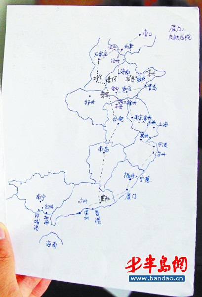 在老葉隨身攜帶的幾張A4紙上,記者看到其中一張整齊地寫著各省沿途的市區縣鎮,還有一張紙上用鉛筆畫著沿海各省的地圖,并用虛線標記出規劃好的往返路線。“我們沒法上高速,只能走普通公路或鄉間小道。行程很隨意,有時候會臨時有些改變。我們并不講究非得到啥知名景點游玩,有時途經一個城市,可能只是到市區公園里小坐閑聊一會兒,走走看看,便繼續開車去下一站。”老葉說,有了這輛三輪車,每天都能接觸新鮮的人 、事、景,老伴的心情越來越好,逐漸走出了病痛的陰影,通過鍛煉扶著欄桿都能自己站起來了。