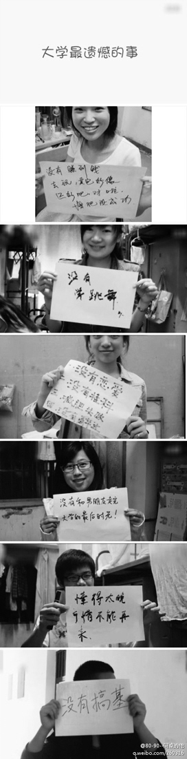“懂得太晚,可惜已不能重來”“看書太少”“沒考上研究生”“找了女朋友,但又被甩了”“沒有向一個人表白”“沒選修戀愛這門課”……在@山東大學學生協會微博中曬出的“遺憾”,主要集中在三個方面:戀愛、交友、學習。山東大學微博協會負責人之一、哲社學院的張彤告訴記者,這個活動是受網絡影響發起的,發起后得到很多同學的響應。他認為,這種“曬遺憾”,對畢業生而言是一種心理宣泄,但對在校生而言就是一種警示,提醒自己別讓遺憾重演。