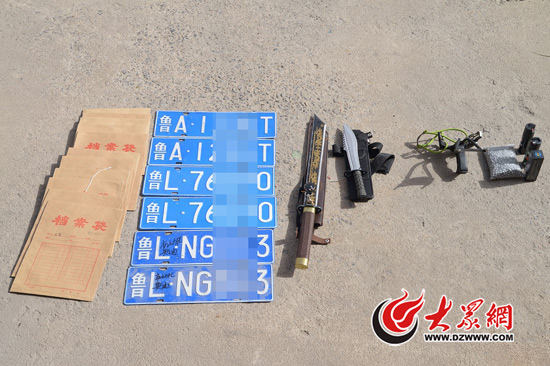交警在孫某車上搜出的管制刀具、催淚噴霧、鋼珠彈弓以及套牌。