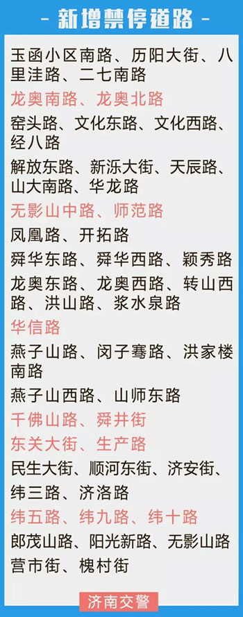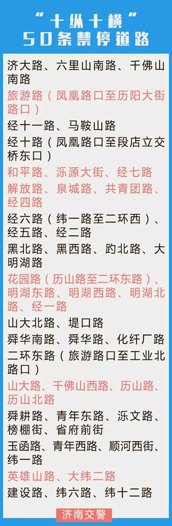 原有的這50條道路分別為:濟大路、六里山南路、千佛山南路、旅游路(鳳凰路口至歷陽大街路口)、經(jīng)十一路、馬鞍山路、經(jīng)十路(鳳凰路口至段店立交橋東口)、和平路、濼源大街、經(jīng)七路、解放路、泉城路、共青團路、經(jīng)四路、經(jīng)六路(緯一路至二環(huán)西路)、經(jīng)五路、經(jīng)二路、黑北路、黑西路、趵北路、大明湖路、花園路(歷山路至二環(huán)東路)、明湖東路、明湖西路、明湖北路、經(jīng)一路、山大北路、堤口路、舜華南路、舜華路、化纖廠路、二環(huán)東路(旅游路口至工業(yè)北路口)、山大路、千佛山西路、歷山路、歷山北路(北園大街到濱河南路)、舜耕路、青年東路、濼文路、榜棚街、省府前街、玉函路、青年西路、順河西街、緯一路、英雄山路、大緯二路、建設(shè)路、緯六路、緯十二路。