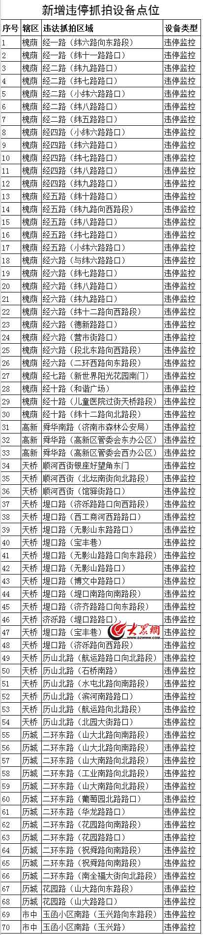 這次新增的50條違停道路有:玉函小區(qū)南路、歷陽大街、八里洼路、二七南路、龍奧南路、龍奧北路、窯頭路、文化東路、文化西路、經(jīng)八路、解放東路、新濼大街、天辰路、山大南路、華龍路、無影山中路、師范路、鳳凰路、開拓路、舜華東路、舜華西路、穎秀路、龍奧東路、龍奧西路、轉(zhuǎn)山西路、洪山路、漿水泉路、華信路、燕子山路、閔子騫路、洪家樓南路、燕子山西路、山師東路、千佛山路、舜井街、東關(guān)大街、生產(chǎn)路、民生大街、順河?xùn)|街、濟安街、緯三路、濟洛路、緯五路、緯九路、緯十路、郎茂山路、陽光新路、無影山路、營市街、槐村街。