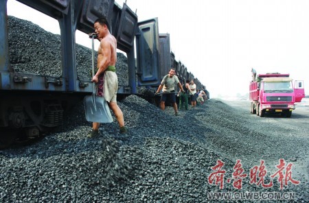27日,在濰坊市煤炭交易市場,十幾節裝滿晉煤的車皮正?吭谠屡_上,工人們正在緊張卸煤。 王媛 攝