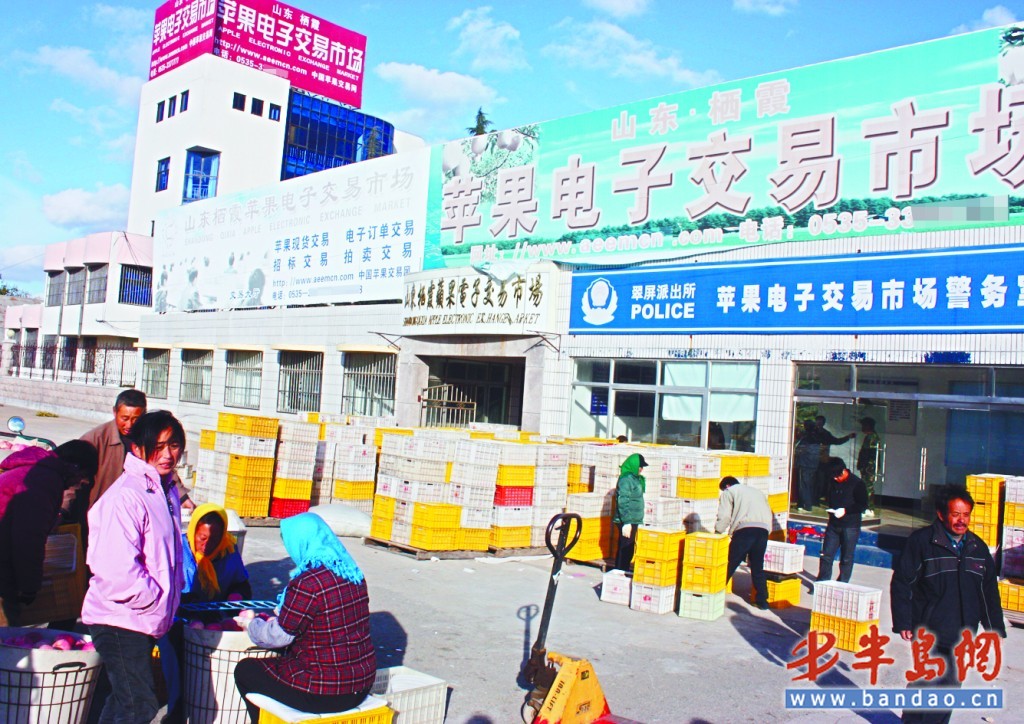 果農(nóng)們?cè)谔O(píng)果電子交易市場(chǎng)門(mén)口包裝蘋(píng)果,蘋(píng)果漲價(jià)吸引了眾多人關(guān)注蘋(píng)果電子交易。