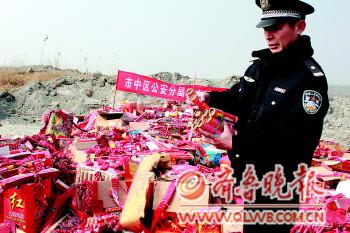 6100萬頭爆竹、1100多個(gè)煙花、80多個(gè)禮花彈隨著噼里啪啦的一陣巨響,化為灰燼。28日上午,濟(jì)寧市公安局中區(qū)分局在市中區(qū)105國道濟(jì)寧電廠煤灰廠空曠地帶,集中銷毀了一批非法煙花爆竹。據(jù)民警介紹,這些非法煙花爆竹大都是仿冒、偽劣產(chǎn)品,很容易傷人。 本報(bào)記者 岳茵茵 本報(bào)通訊員 孟翔鯤 李新輝 攝影報(bào)道