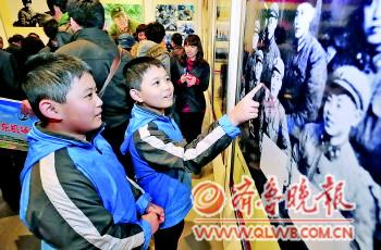 18日,雷鋒事跡大型原創攝影作品展在山東博物館開展。300余幅雷鋒不同年份的照片向社會還原一個真實的雷鋒。圖為兩名學生在參觀展覽。