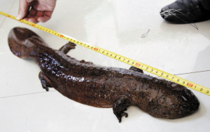 4月3日,碧霞湖水庫工作人員在清理泄洪口時意外捕獲一條“從來沒見過的魚”,該魚呈青黑色,頭平,口大,眼小,膚褶,四肢短扁而微蹼,體表光滑,有斑塊,體長62厘米,寬11厘米,體重為2.8公斤。