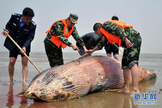 4月28日,邊防和漁政人員在查看死亡的鯨魚。(尹濤濤 攝)