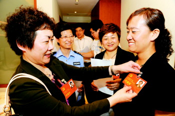 ▲5月22日,出席省第十次黨代會的煙臺代表團的代表報到后,興高采烈地將出席證佩戴在胸前。□記者 湯序民 房賢剛 報道