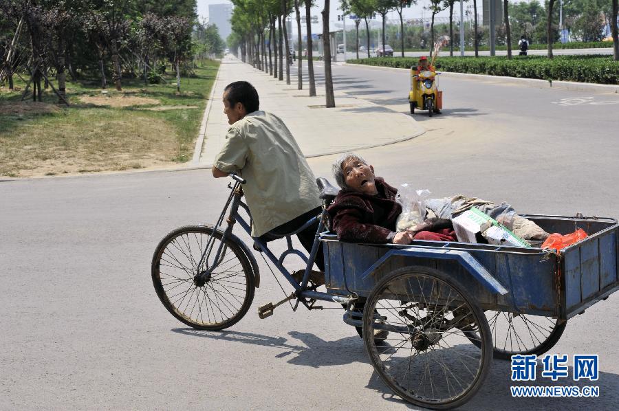 山東省濟南市段店鎮(zhèn)彭家莊農民王瑞勤,20年前因故失去一條腿,家中還有一位現(xiàn)年81歲的老母親癱瘓在床。多年前,當?shù)卣畬⑼跞鹎谀缸觿澣搿拔灞簟保獜姷乃詧猿钟萌嗆囕d著母親外出撿拾垃圾,用以支撐他和老母親的生活。他身殘志堅,不離不棄的事跡在當?shù)貜V為流傳。2006年,王瑞勤被評為“山東當代十大孝子”之一。新華社發(fā)(朱津明 攝)