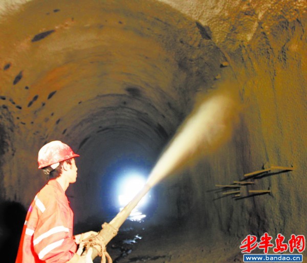 6月20日,施工人員噴漿加固剛剛貫通的隧道。