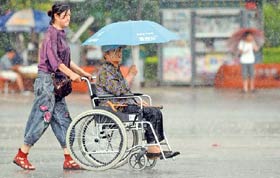 6月29日,市民行走在濟南街頭。當日,山東省出現降雨天氣,局部地區暴雨,覆蓋全省的此次降雨有效緩解了旱情。2012年以來,山東平均降水量只有102.7毫米,比歷年同期偏少45.7%,3702萬畝農田出現不同程度的旱情。新華社記者徐速繪攝