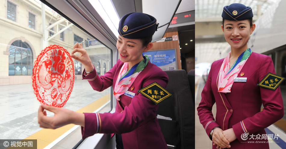 2017年1月21日,青島客運(yùn)段北京動(dòng)車隊(duì)的90后列車長(zhǎng)白俊來(lái)在即將駛離的春運(yùn)列車上貼窗花。白俊來(lái)為青島客運(yùn)段“五朵金花”列車長(zhǎng)之一,今年的春節(jié)是白俊來(lái)在春運(yùn)列車中的第七個(gè)春節(jié),她已經(jīng)連續(xù)七年未能在蘭州老家陪父母過(guò)一次團(tuán)聚的年三十。今年元月,白俊來(lái)同24位青島客運(yùn)段優(yōu)秀勞務(wù)工被濟(jì)南鐵路局轉(zhuǎn)為正式職工。