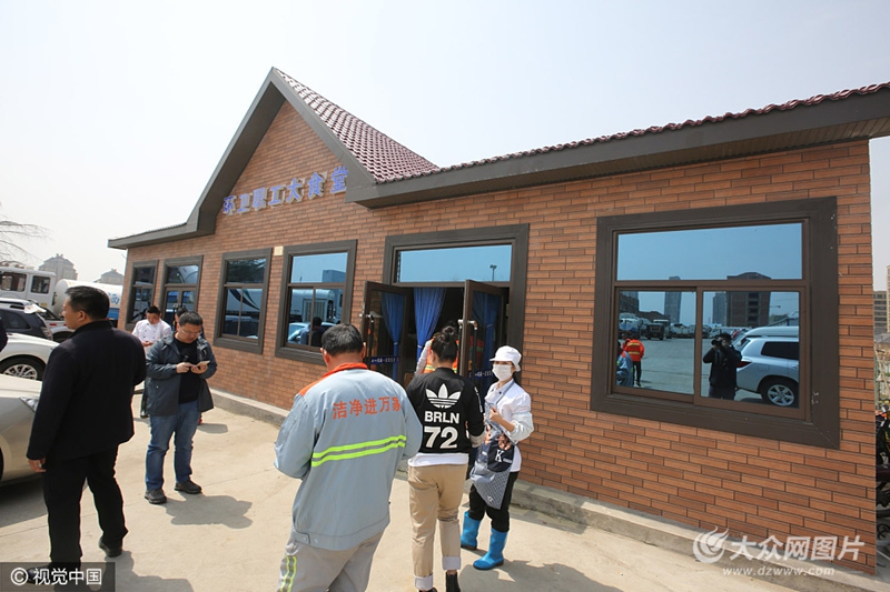 2017年4月11日,山東省青島市,2-4元即可讓風吹日曬堅守一線的環衛工人吃頓葷素搭配的豐盛午餐,成為李滄區街頭巷尾的美談。據了解,為解決城市美容師在戶外用餐問題,李滄區共投入85.85萬元建設三座環衛工人食堂,環衛工人每天只需繳納2-4元的餐費,就可以在食堂享受6-10元的標準午餐,讓一天勞作在大街小巷的環衛工人在午餐時間有個干凈整潔的就餐環境和一份菜、飯、粥、湯俱全的低價午餐。