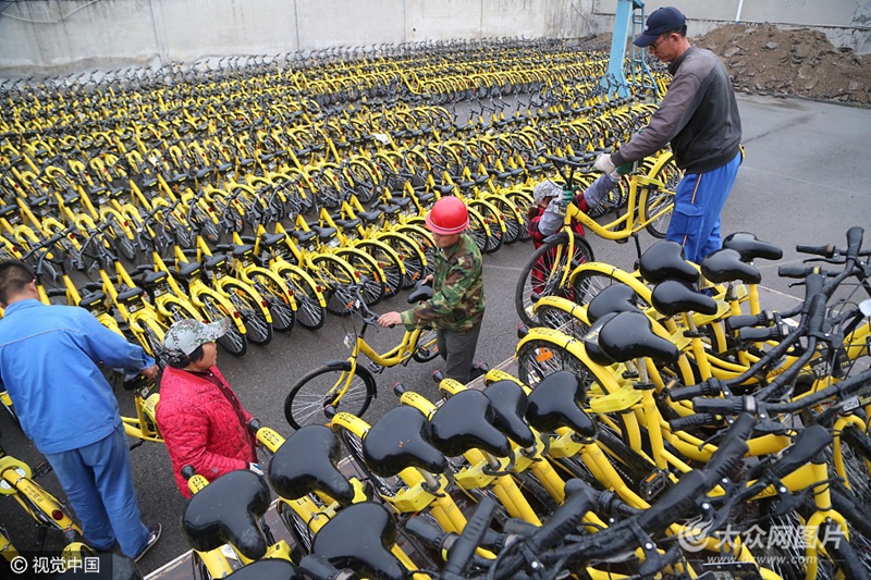 2017年4月10日,山東泰安,許多市民發(fā)現(xiàn)街頭多了一排排“小黃車”。這些“ofo共享單車”在4月9日晚上11時左右開始在泰城各主要街道進行投放。一夜之間,小黃車遍布泰安街頭。相關媒 體從泰安市公用事業(yè)管理局了解到,這次“ofo共享單車”進入泰安未經(jīng)過任何審批,擅自利用人行道、盲道等城市公共設施進行營利性經(jīng)營行為,影響市民出行。10日上午,泰安城管部門下達清理通知后,下午2點開始集中清理道路兩側(cè)隨意擺放的ofo小黃車。千余輛”ofo共享單車”投放不到一天便被統(tǒng)一清理存放進行證據(jù)保存。